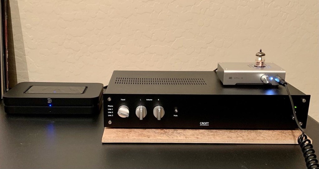 Bluesound Node, Croft Phono Integrated, Schiit Vali 2 and Grado SR80s (out of view)