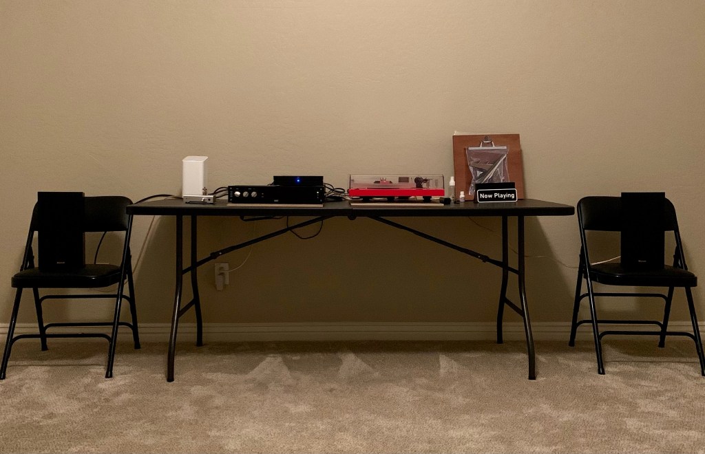 I had a scare the first night I set them up. I placed them on the folding table that serves as my temporary stereo rack (see below) and they sounded atrocious – like the pocket transistor radios of my youth – tinny. I was disappointed and prepared to return them.