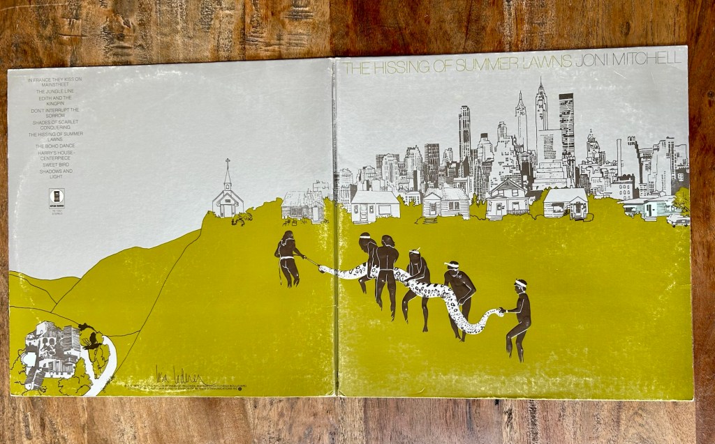 Joni always has excellent album art and packaging. This cover art is created by Joni (a common feature of her albums). It uses the African theme of “The Jungle Line” by superimposing an image of dark-skinned people carrying a giant snake (both were embossed on the original vinyl album cover) on the Los Angeles skyline, with Mitchell’s house on the back cover. On the interior of the gatefold are the lyrics, liner notes, and a swimming Joni radiating her femininity.