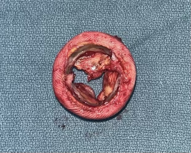 Surgery was on October 29, and sure enough, the old artificial tissue valve (which was porcine, AKA pig) was in awful condition. Below is a stock picture of what the valve looked like when it was first installed and a photo of what it looked like after removal by the surgeon. The significant gaps in the “after” photo are why I had so much trouble breathing. It turns out that the St. Jude Trifecta valve I had installed has been taken off the market as it has not performed as well as its competitors. My surgeon said I was lucky to get thirteen years out of it – most were failing at the eight-year mark.
