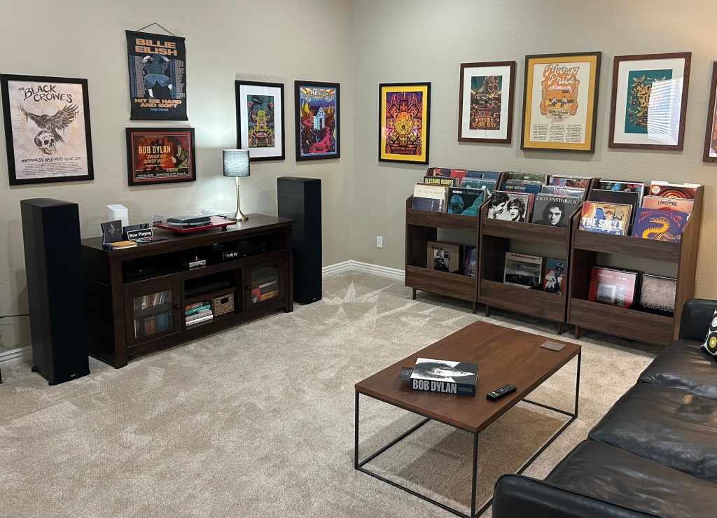 Paradigm Premium 800F speakers, Bluesound Node streamer (Tidal), Croft Acoustic Phono Integrated amplifier, Rega P3 turntable (stock cartridge), Schitt Vali 2 headphone amplifier, Sony UBP-X800M2 Blu-ray (for CDs – note there is not a TV in this room), Joey G DAC, and DROP.com + HiFiMan HE5XX Planar Magnetic Headphones