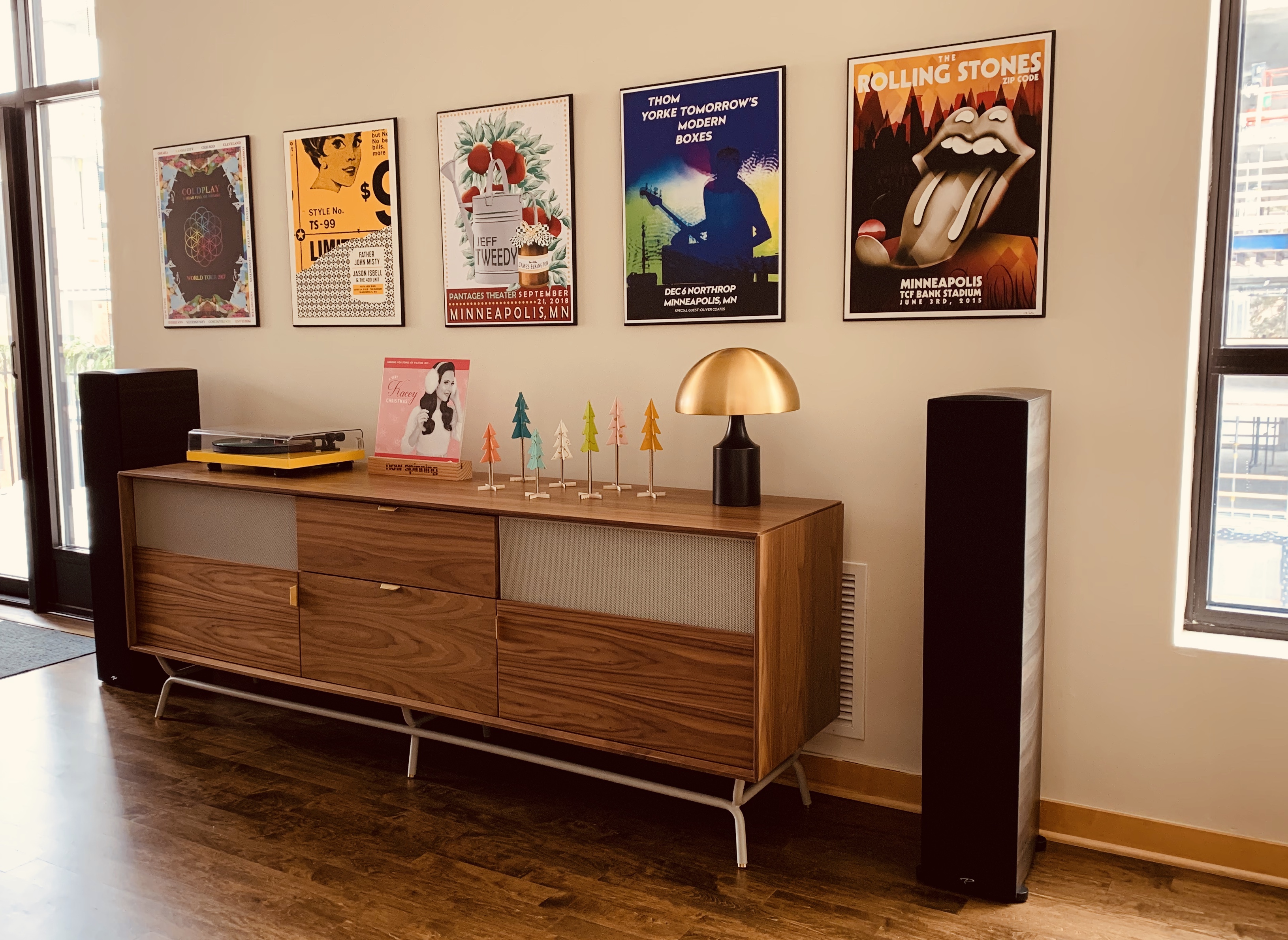 We went to Stereoland and listened to their Paradigm, KEF, and Golden Ear speaker lines. We fell in love with Paradigm’s Premier 800F speakers despite the fact they were over our price point. The 800Fs checked all the boxes above and so we walked out with a pair with an espresso grain finish.