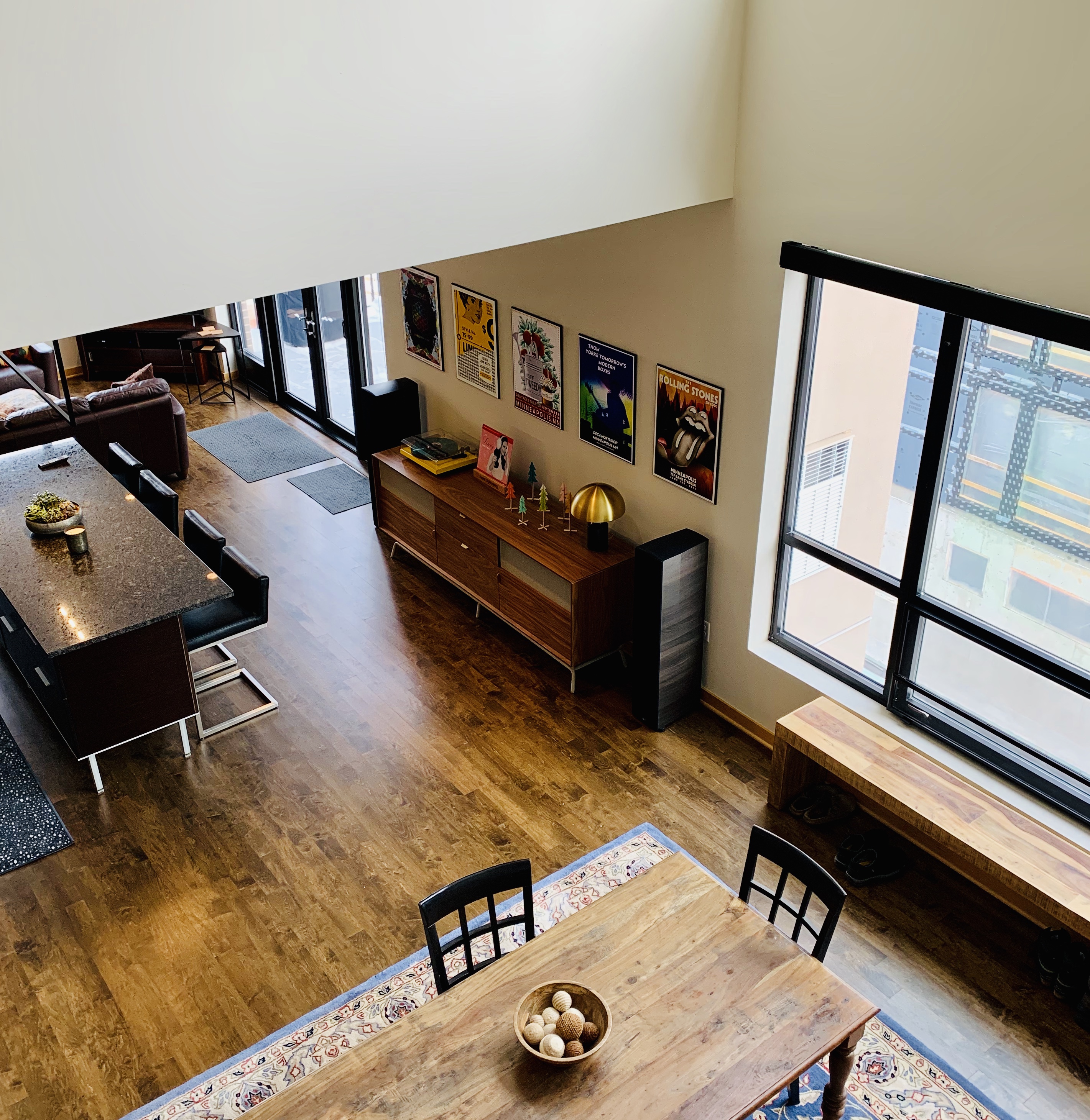 (Above) this gives you a sense of the sonic challenges of our listening space: long room, 10′ ceilings on the left channel and 20′ on the right.